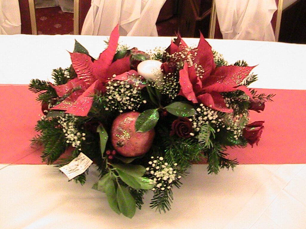 A classic and sparkling Christmas arrangement featuring a red poinsettia, a symbol of the holidays, and a decorative glitter pomegranate. The pomegranate, a symbol of abundance and good luck, adds a festive touch, while the white gypsophila creates a contrast with the bright red color. Green branches and decorative elements complete the arrangement, making it ideal for table decoration or as a gift to loved ones during the Christmas season.